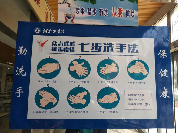 39.在就餐場所配備足夠的可以正常使用的洗手消毒設施,洗手設施上方張貼規(guī)范洗手步驟示意圖,全面普及“內-外-夾-弓-大-立-腕”的七步洗手法,引導師生餐前洗手并成為習慣。